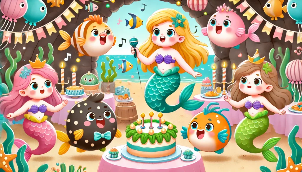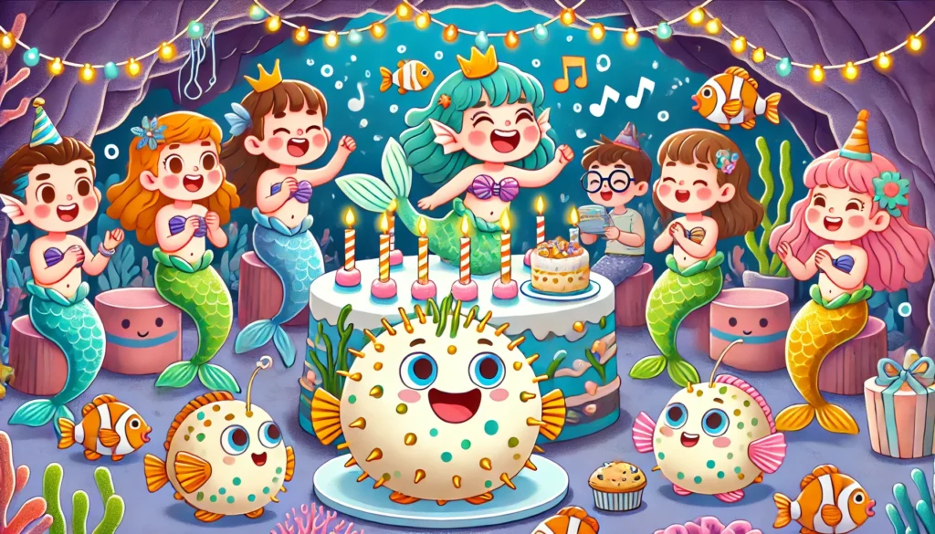 Parti başlamış ve herkes çok eğlenmiş. Deniz şarkıları söylemişler, balon balığı Bobo’nun gösterilerini izlemişler ve lezzetli deniz yosunu pastası yemişler. Ancak en büyük sürpriz henüz gelmemişmiş.